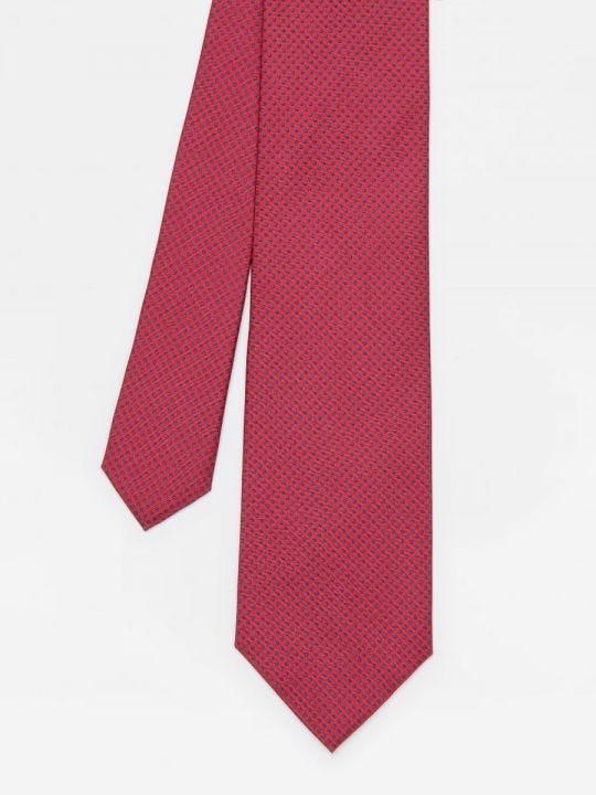 Červená kravata s drobným vzorem modrých koleček, který oživí celý Váš outfit do práce nebo na večírek. Naše kravaty se dají lehce sladit s košilemi i obleky.
